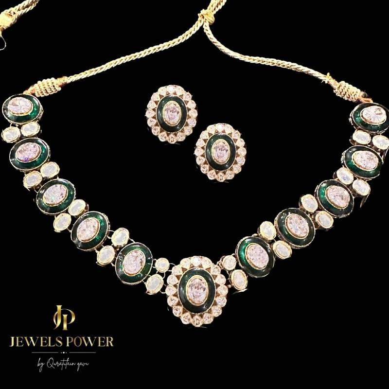 An exquisite uncut Polki choker set crafted with fine quality detailing. Paired with statement studs and embellished with emerald high-definition meenakari, Polki Wave is a timeless expression of elegance a perfect gift for mothers or someone truly special.