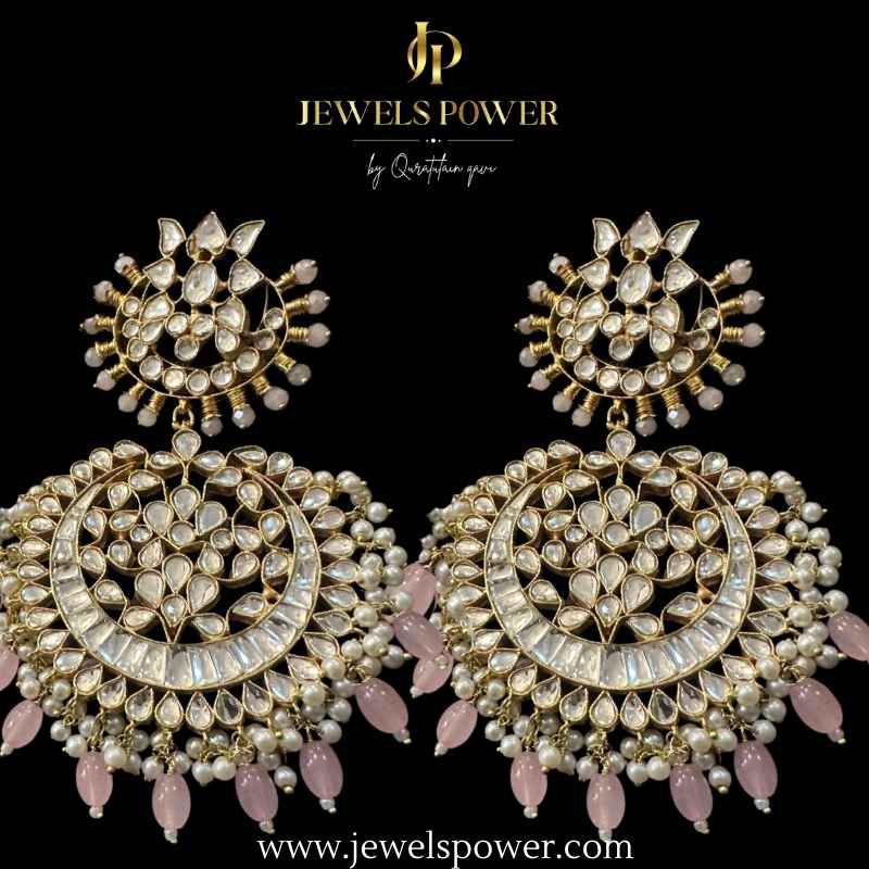 Premium quality kundan quality kundan polki Chand balliyan ,with power pink pearls attachments & beads ,24carat gold plated.