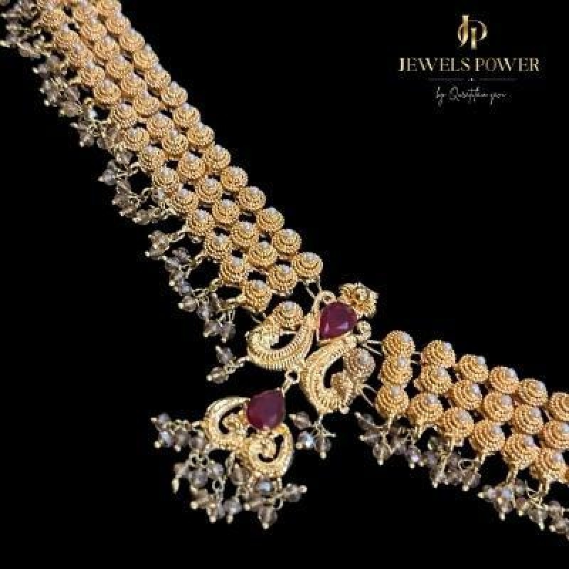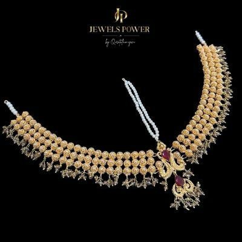 Mavra is an exquisitely handcrafted Jarao Matha Patti, finished in rich 24-carat gold plating. Adorned with beautiful champagne-toned hangings, it completes the bridal look with timeless elegance and royal charm.