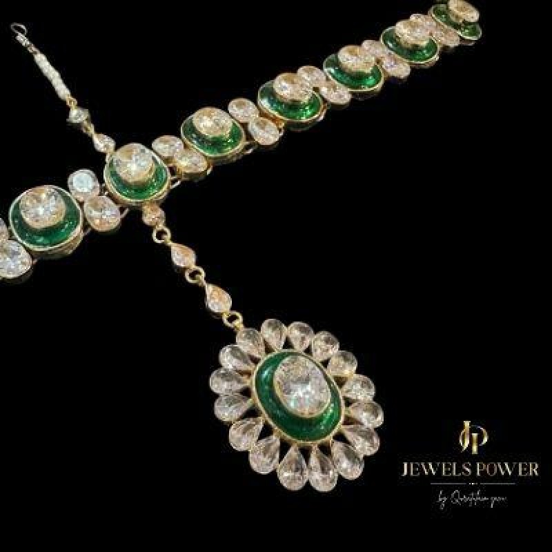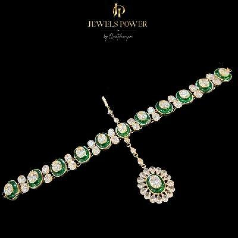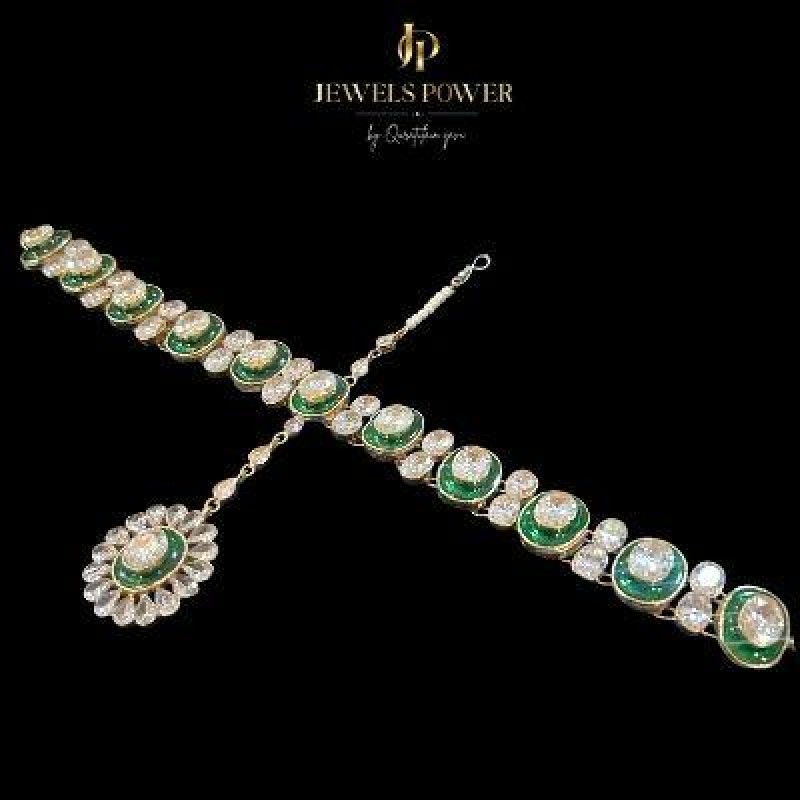 Mahro is a premium luxury Sheesh Patti crafted with uncut polki and finished in rich 24-carat gold plating. Accented with green high-definition meenakari, it adds a refined royal touch perfect for brides and festive occasions.