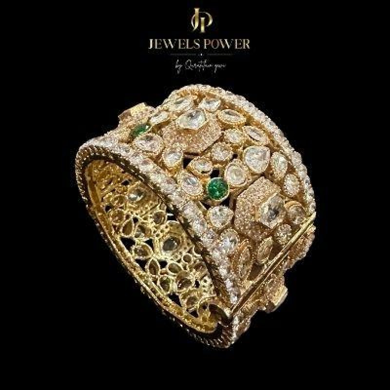 Zar-e-Jahan is a handcrafted Polki Jarao Kangan, crafted on a high-quality base with diamond-cut polki detailing. Finished with advanced plating techniques and a lasting layer of 24K gold, this timeless piece is designed for durability, elegance, and enduring bridal charm.