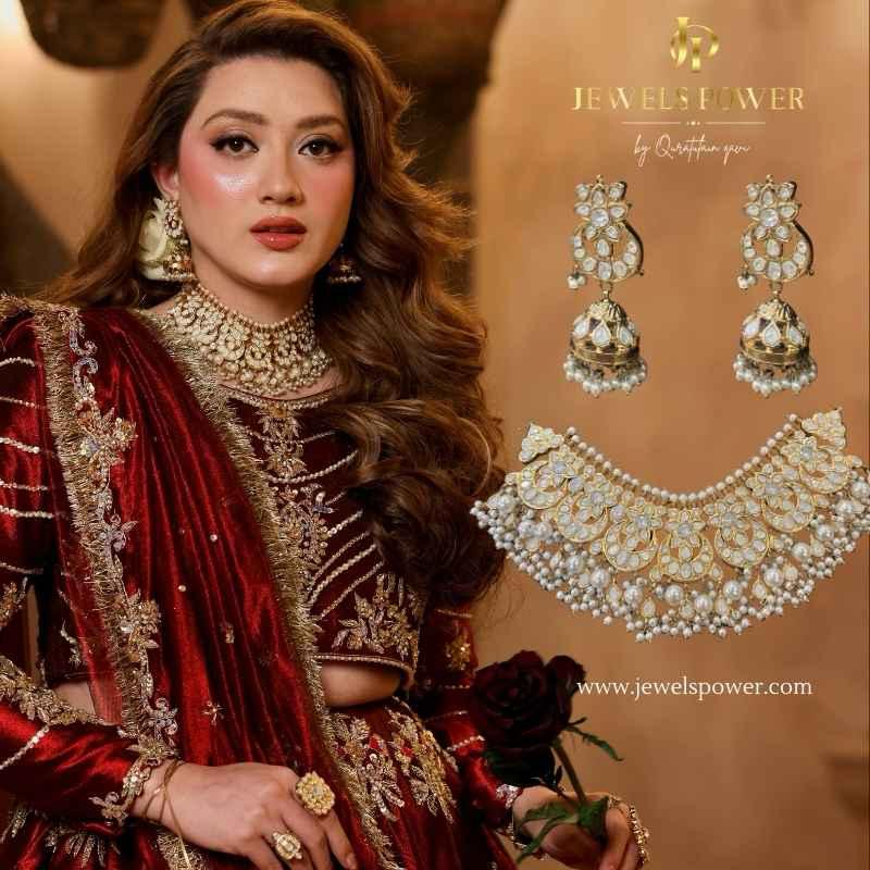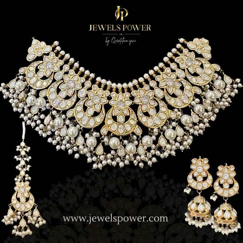 Pearls Mirage is a luxurious uncut polki guluband, exquisitely finished with 24-carat gold plating. Adorned with elegant pearl detailing, this statement piece reflects timeless sophistication and celebrity-inspired glamour. Designed for brides and festive occasions, Pearls Mirage adds a refined aura of grace and luxury to every look.