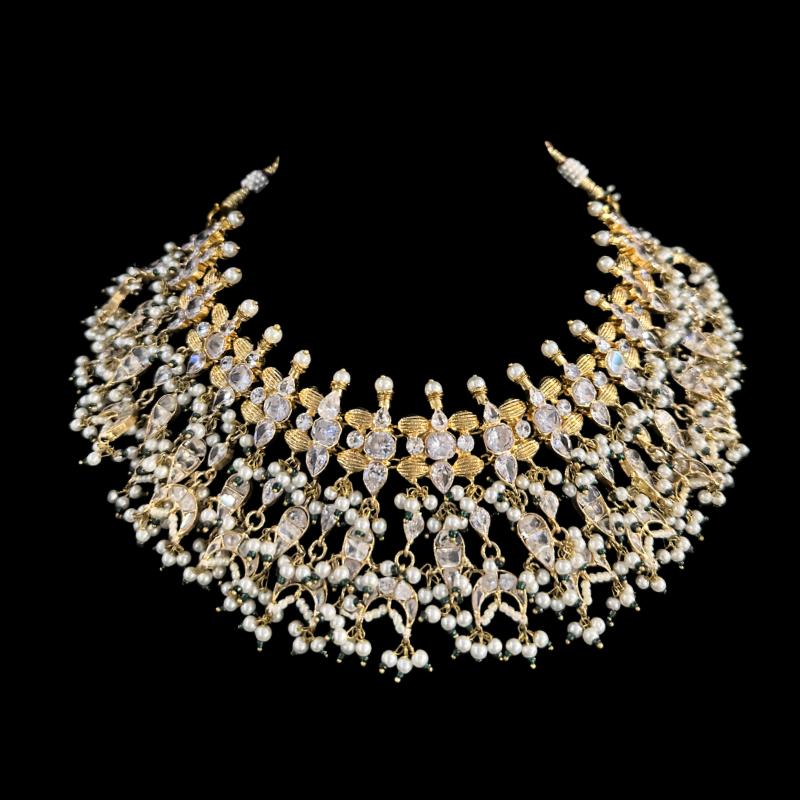 Momina is an exquisitely handcrafted uncut polki choker, finished with rich 24-carat gold plating. Designed as a luxury statement piece and proudly featured on Momina Iqbal, this elegant creation reflects timeless glamour, refined craftsmanship, and celebrity-worthy sophistication. Perfect for brides and high-profile festive looks.