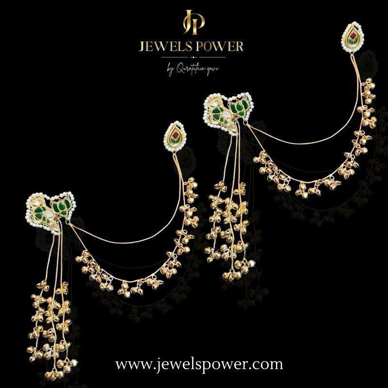 Meet is a statement pair of handcrafted earrings featuring exquisite Kundan motifs, beautifully attached with delicate ghungroo detailing and 24-carat gold-plated chain drops.