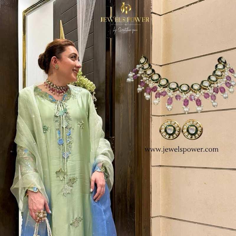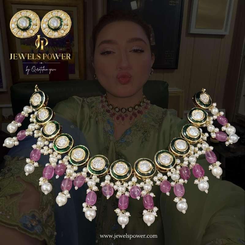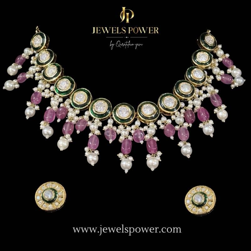 Uncut polki jarao 24carat gold plated statement necklace paired with elegant Polki studs ,all Mother Nature Real beads used in this set.