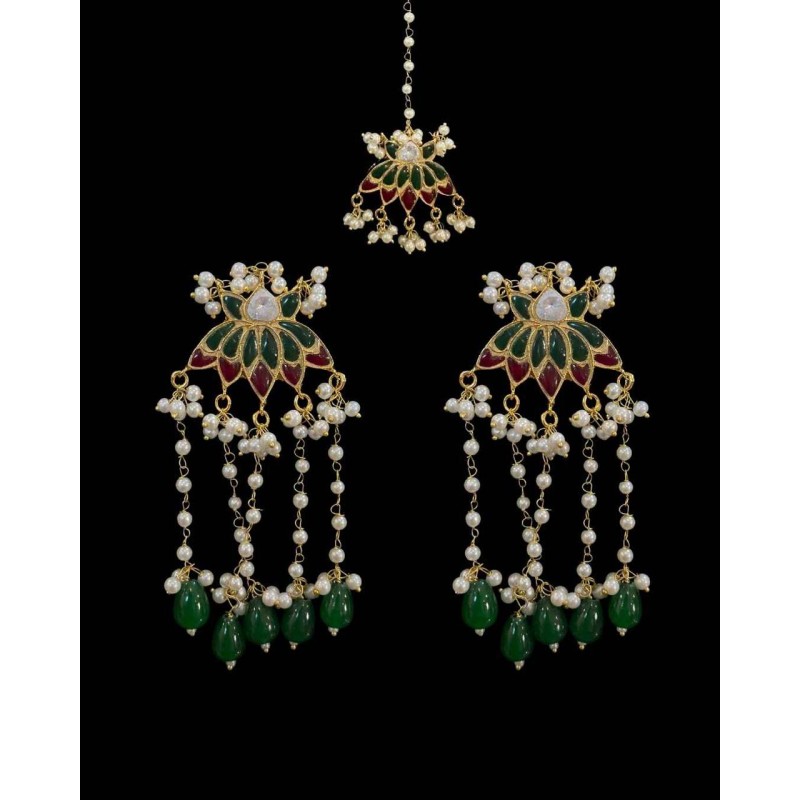 Gulkari is a celebration of traditional artistry. These Farshi Kundan hand-crafted earrings with matching tikka are exquisitely designed using ruby and emerald Kundan jarao work. Finished with premium 24-carat gold plating, this set reflects timeless elegance and royal charm perfect for weddings, festive occasions, and heirloom styling.
