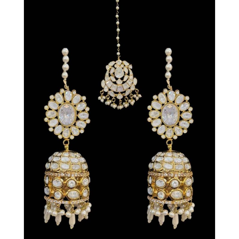 Hand crafted uncut polki 24 carat gold plated statment Earrings & tikka set ,embalished with pearls details.