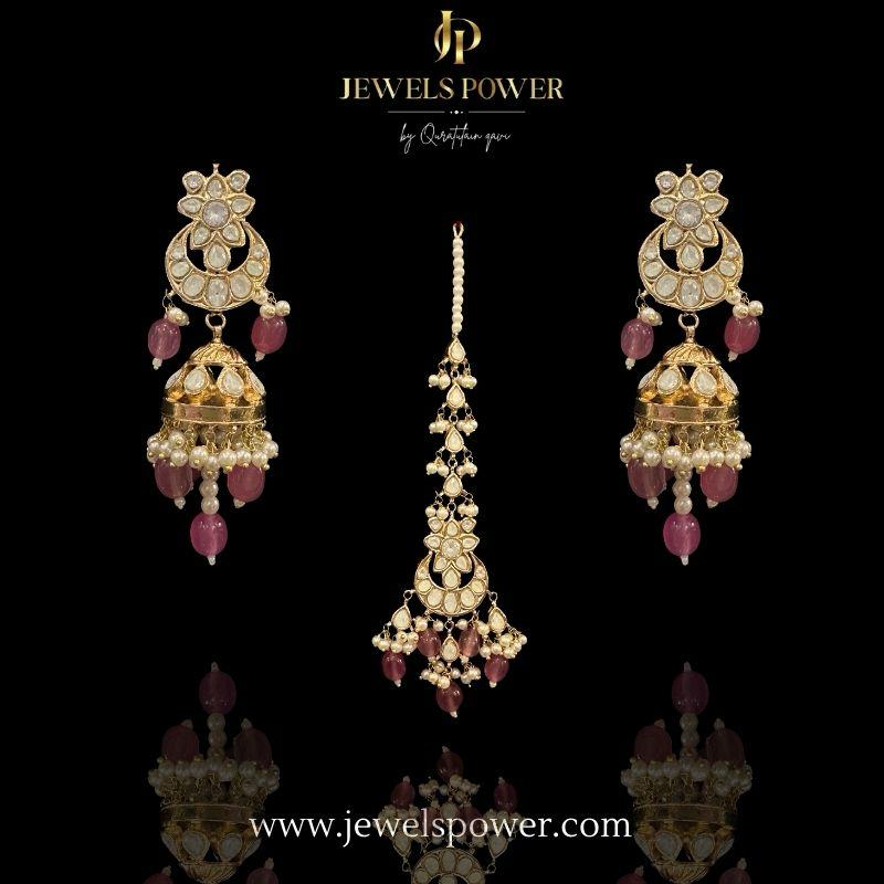Hand crafted uncut polki 24 carat gold plated earrings tikka set.