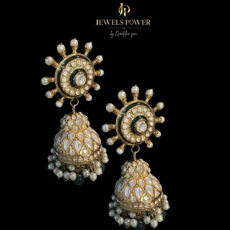 Uncut polki 24-carat gold-plated luxury jhumkaas, adorned with high-definition green meenakari and embellished with delicate pearls.